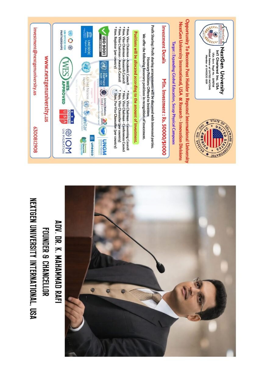 USA — Under the visionary leadership of Adv. Dr. K. Mahammad Rafi, Founder & Chancellor, NextGen University International, USA continues to expand its global academic footprint. Supporting this mission is Adv. Dr. Afreen Banu, serving as Global CEO, and Adv. Dr. Arif Nasir Butt, Chairman – Academic Council, who together provide strategic, academic, and operational leadership to the institution’s international growth and quality framework.
